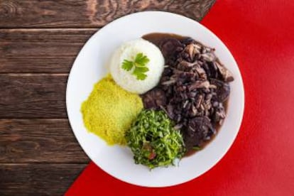 La feijoada fue importada desde Portugal y adaptada hasta alcanzar identidad propia en Río, donde se convirtió en un guiso con trozos de carne de cerdo y frijoles negros (feijões), acompañado de arroz blanco, farofa (harina de mandioca) y repollo al vapor. Una feijoada carioca típica debe llevar: