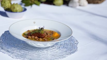 Mostramos uno de los platos estrella del parador de la Alhambra, un potaje de habichuelas únicas en el mundo que solo se pueden degustar en este recinto histórico con vistas al Generalife