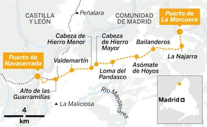Desde La Morcuera (1.774 metros) hay dos posibles alternativas para iniciar la Cuerda Larga, una siguiendo el sendero PR-M11 hasta llegar al collado de la montaña y otra tomando una trocha local marcada con señales verdiblancas. El primer itinerario es bastante más cómodo y evita la cima de La Najarra; el segundo, más empinado e incómodo, conduce a lo alto de este formidable mirador natural sobre la meseta madrileña. Si el objetivo es no perderse ni una sola sensación de esta magnífica ruta, es preferible la segunda senda. Cuarenta y cinco minutos después de atacarla —a lo largo de este primer tramo del recorrido, probablemente el más duro, se supera un desnivel de 350 metros—, uno se encuentra contemplando el grandioso incendio de luces que se extiende a los pies de la sierra de Guadarrama. Un espectáculo impresionante. La atmósfera era tan nítida en esos tiempos posconfinamiento que se divisaban perfectamente las Cuatro Torres de Madrid.