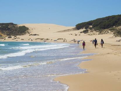 Esta playa del municipio de Tarifa envicia: 3.800 metros de arenas blancas lamidas por un mar turquesa, una majestuosa duna y, como telón de fondo, las ruinas de la ciudad pesquera romana de Baelo Claudia. La duna, que está declarada monumento natural, se levanta a más de 30 metros de altura y se alarga unos 200 metros de ancho e, impulsada por el levante, avanza lenta tierra adentro, enterrando poco a poco a los pinos piñoneros. Los que sí avanzan raudos aquí con los vientos del Estrecho son los windsurfistas.