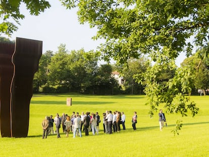 Ver las grandes obras de Eduardo Chillida en los prados que rodean el caserío Zabalaga, que el propio escultor rehabilitó en Hernani, es algo tan grato y natural como ver su famoso Peine del viento al borde del mar, en San Sebastián, en lugar de en un frío museo. “Un día soñé una utopía: encontrar un espacio donde pudieran descansar mis esculturas y la gente caminara entre ellas como por un bosque”, dijo el escultor. Ya no es un sueño. Es Chillida Leku. A lo largo y ancho de una parcela de 13 hectáreas se descubren 40 de sus esculturas de diferentes tamaños, tirando a inmensas. Las más grandes son Lotura XXXII, de 64 toneladas, y Buscando la luz I, de 22. En condiciones normales (prepandemia), a los visitantes se los anima a palpar las obras para sentir la fuerza de los materiales de que están hechas: acero y piedra (sobre todo, granito rosa). Ahora es casi mejor no tocar nada.