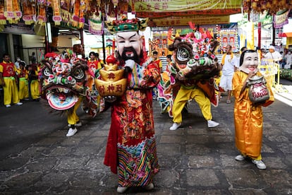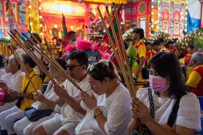 Cae la noche, se prenden los neones y las lámparas chinas a lo largo de la calle Yaowarat, la arteria principal del Chinatown de Bangkok (Tailandia). Y bajo la atenta mirada de los dragones fluorescentes en un soi (callejón) adyacente, unos actores camuflados bajo otro dragón de tela serpentean en medio de un estruendo de gongs y tambores, iluminados por velas y envueltos en aromas de incienso. Yaowarat, su paralela Charoen Krung y varias otras calles del barrio chino de la capital tailandesa están tomadas durante esta última semana de octubre —del 20 al 29 de octubre en 2025— por hileras de puestos de cocina donde sirven fideos, sopas especiadas, dumplings de verduras y otras delicias que no deben incluir ajo, cebolla, chiles ni, por supuesto, rastro alguno de proteína animal.