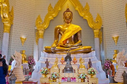 En las pagodas Kuan Yin (Guayin en mandarín), consagrada a la diosa de la Compasión, y ChowSue Kong —donde se reverencia al espíritu del Agua y por ello se alza casi a orillas del río Chaopraya— los devotos acuden a recitar sus mantras y promesas con las palmas de las manos juntas en una penumbra apenas iluminada por grandes velones rojos. Mientras los turistas aprovechan para visitar Wat Traimit, el Templo del Buda Dorado en la confluencia de Yaowarat y Chaoren Krung.