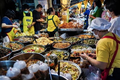 En las fachadas y puestos de comida de Yaowarat y los sois adyacentes, la sílaba je, una promesa de pureza, ondea estos días en caracteres thais y chinos en banderas amarillas sobre los humeantes woks donde se preparan brochetas de tofu, rollitos, bollos y dimsum rellenos de champiñones, “pollo de soja crujiente”, currys y sopas con leche de coco; o se aliñan ensaladas de papaya que, por una vez, se sirven sin la omnipresente salsa de pescado thai.