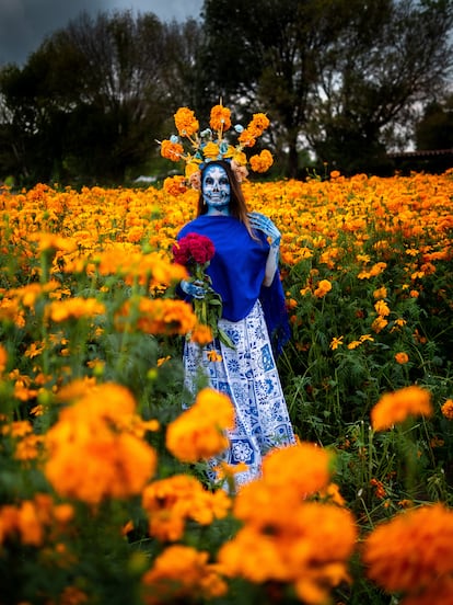 Una de las experiencias más bellas es recorrer los campos de cempasúchil, flor emblemática del Día de Muertos y símbolo del camino que guía a las almas de regreso al mundo de los vivos, que se extienden por todo el país. Un par de semanas antes de la celebración, los sembradíos se tiñen de un naranja intenso y reciben a cientos de visitantes que caminan entre los surcos, compran flores o se maquillan como catrinas para tomarse fotografías.
