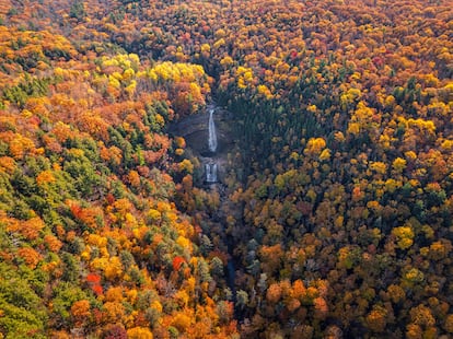 Cuando necesitan aire, los neoyorquinos cruzan los altos desfiladeros de Manhattan, toman la carretera 9 hacia el norte desde Harlem y siguen el curso del Hudson —un río que se emborracha con aceite, decía Lorca— hasta las suaves cumbres de los Catskills, que cambian de color con las estaciones y que en otro tiempo marcaron la frontera natural de Estados Unidos. En estas montañas se puede pescar con mosca o ir en kayak por sus ríos y lagos, emprender largas caminatas por senderos boscosos, deslizarse por las pistas de una estación de esquí, jugar al golf en uno de sus seis campos públicos o incluso alojarse durante un fin de semana en alguna granja, donde la vida rural calmará el estrés urbano. También se puede, sorteando el riesgo, asomarse a las fabulosas cataratas Kaaterskill, que son más altas que las del Niágara —tienen algo más de 70 metros de caída en dos niveles— y cuya belleza ha inspirado desde hace más de un siglo a pintores y escritores, como Thomas Cole o John Burroughs.