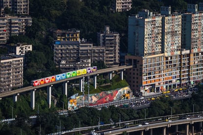 Ubicada en el oeste del país, la ciudad es un imán para la gente joven que escapa de la competitividad de Pekín y Shanghái, y su sinuosa orografía obliga a soluciones arquitectónicas divergentes que se han hecho virales en redes sociales. A la altura de la estación de Liziba, el monorraíl elevado que bordea las colinas atraviesa un edificio residencial por dentro. Cientos de personas, a los pies, siguen con sus móviles al convoy, antes de que se pierda rumbo al distrito financiero.