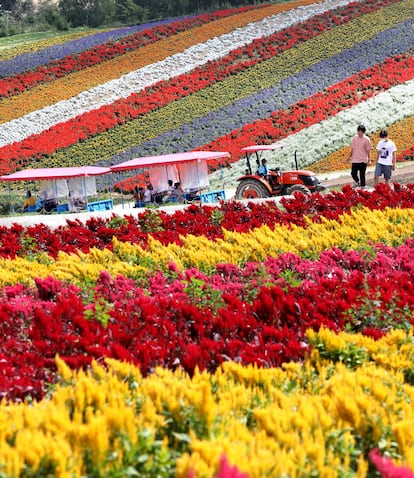 A una media hora en coche desde Asahikawa espera la primera parada: Shikisai-no-oka, un ordenado jardín situado en una colina cuajada de flores con vistas a la cordillera Tokachi. Como un arcoíris, se despliegan tulipanes, lavanda, girasoles, dalias… Su máximo esplendor es en los meses de verano, aquí mucho más suave que en el resto de Japón, aunque, como en tantos otros sitios, el de 2025 lo recuerdan como uno de los más calurosos. Esa es una de las razones por las que se están viendo osos pardo —en Japón, solo viven en esta isla— donde antes no llegaban.