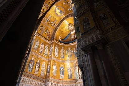 Para completar el recorrido por las joyas de la época normanda, es imprescindible escaparse hacia Monreale para visitar su Duomo. Sin exageración, es uno de los legados más importantes del arte mundial de todos los tiempos: más de 6.000 metros cuadrados de relucientes mosaicos dorados, con un complejo programa iconográfico, que parece converger hacia el Cristo Pantócrator en lo alto del ábside central.