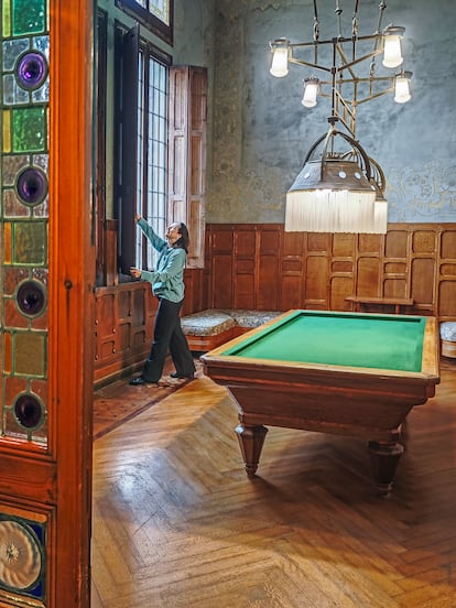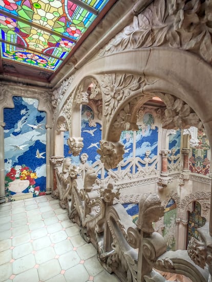 Otro inmueble modernista donde se puede entrar (de hecho, es el más ajetreado de la ciudad, con más de 50.000 visitantes al año) es Casa Navàs. Pero solo se puede entrar con patucos quirúrgicos y sin tocar nada, para no ajar ninguna de las tropecientas mil flores que hay pintadas, labradas, vidriadas, forjadas y esgrafiadas por doquier. Joaquim Navàs y su mujer, Pepa Blasco, no eran floristas. Eran ricos comerciantes de telas que encargaron a Lluís Domènech i Montaner esta Consagración de la Primavera arquitectónica, esta locura florida de 5.500 metros cuadrados. El mosaico que hay en la entrada —un jardín de almendros en flor— lo esbozó el pintor modernista Joaquim Mir, que entre 1903 y 1906 estuvo internado en el Institut Pere Mata, no porque hubiera tenido un accidente en Mallorca, como dice la web de Casa Navàs, sino porque sufría una depresión. Ni estigma, ni negación. Lo mejor, en salud mental, es llamar a las cosas por su nombre.