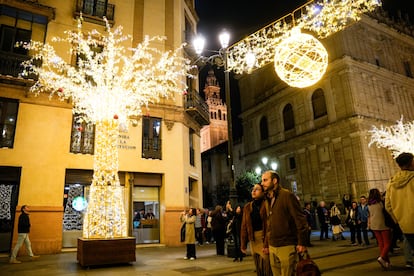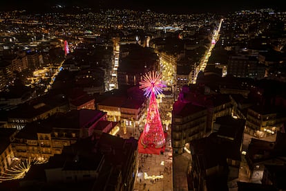 Vigo destaca, a golpe de lúmenes y metros, en la carrera navideña hacia lo más brillante y lo más grande. Fue la primera ciudad española en encenderse, el pasado 15 de noviembre —el pueblo sevillano de Estepa se le adelantó una semana—, tras el exultante mensaje de su alcalde, Abel Caballero: “Vigo tiene el inmenso honor y privilegio de ser el símbolo de la Navidad en todo el planeta Tierra”. Hasta después de Reyes, estará iluminada por cerca de 12 millones de luces led instaladas en 460 calles y plazas (40 más que el año pasado, según acota el Ayuntamiento). Mención especial merece el árbol de Navidad de 45 metros de altura, adornado con 100.000 bombillas que resplandece en la Puerta del Sol viguesa.