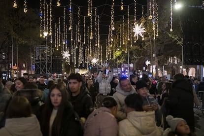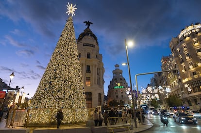 La Gran Vía de Madrid estrena alumbrado navideño, inspirado en la estructura estrellada de los copos de nieve, con 309.000 puntos de luz led; 125.000 tiene el abeto de 22,2 metros que se alza en su confluencia con la calle de Alcalá. Más de 85.100 incorporan los tres ángeles de 10,2 metros instalados en la glorieta de la plaza de Carlos V; 70.000 contiene el nacimiento de 12 metros de alto en la plaza de las Cortes; casi 14.500 forman la vela gigante de Nuevos Ministerios; 8.000, el Niño Jesús de siete metros de diámetro colocado en el puente de Ventas. Y 227.600 el montaje de Ben Busche recreando un amanecer en la calle Goya… En total, la capital refulgirá, hasta el 7 de enero, con más de 13 millones de bombillas brillando en más de 240 emplazamientos de sus 21 distritos.