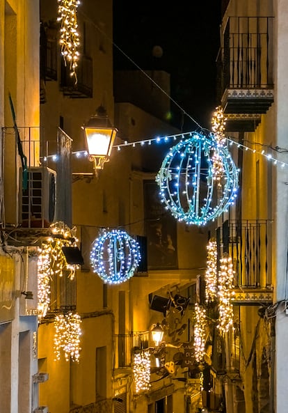El 28 de noviembre, Peñíscola encendió su Llum del Nadal con una coreografía de 150 de drones que representaron en el aire Cuento de Navidad. A partir de ese momento, y hasta el 11 de enero, la iluminación festiva resalta calles y plazas de la ciudad antigua, incluida buena parte de las murallas renacentistas. “La característica silueta de Peñíscola se verá enmarcada en luces navideñas”, comentó en nota de prensa el concejal de Turismo y Fiestas, Ramón Simó, antes de la inauguración. En cuestión de lúmenes, el plato fuerte es la plaza Santa María, donde se concentra el alumbrado de Ferrero Rocher —la localidad fue Pueblo Ferrero Rocher en 2023—. En esta plaza tiene lugar el mercado de Navidad, epicentro de la fiesta.