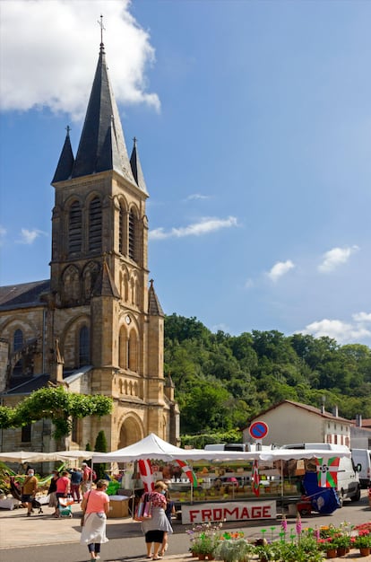 En el mercado de Peyrehorade se siguen concentrando un centenar de puestos de queso, frutas, verduras y pan desde el siglo XIV. Los gaves, como se conoce a los ríos en lengua gascona, no solo han modelado la vida en estos parajes exuberantes, sino que han convertido a la zona en un importante núcleo de producción de foie gras y salmón.