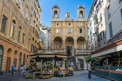 De esta catedral desterrada en su rango iremos hacia la Piazza Banchi, una de las más singulares de esta urbe portuaria, y como interludio entre la misma y San Siro pararemos un instante en San Luca, de 1650 e ideal como excusa para transitar por su homónima calle, bulliciosa y con buenos puestos para comer focaccia, la pizza local, barata y estupenda para recargar energías. Con o sin ellas, la Piazza Banchi, con quioscos y tenderetes de segunda mano, es como una caja con una iglesia arquetípica de Génova, donde las más preciosas se topan contigo de sopetón y así su memoria permanece con más fuerza una vez termina el viaje.