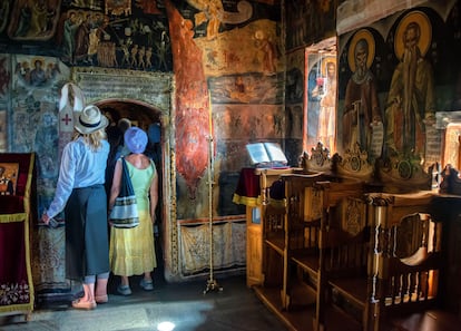 Dentro del templo, cuando el ojo se acomoda al contraste entre la luminosidad exterior y la oscuridad del interior, sorprenden los frescos que recubren techos y paredes. En la cúpula, el Pantocrátor rodeado de ángeles. Por debajo, evangelistas, apóstoles y profetas. Y en la parte inferior, los fieles. Sin embargo, es en el nártex que precede a la iglesia donde se encuentran las pinturas más sorprendentes: la minuciosa, colorista y tremendista representación de los suplicios sufridos por santos, desde decapitaciones hasta aplastamiento o la quema en vida.