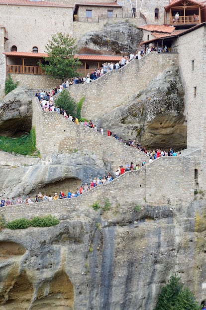 Tampoco se conserva —en este caso, afortunadamente— la forma de acceder a este y al resto de monasterios. Hasta el siglo XVII solo se podía mediante redes que lanzaban los monjes desde lo alto para luego, con la ayuda de cuerdas y poleas, izar alimentos, enseres y personas. Hoy, basta subir 300 peldaños para visitar el monasterio del Gran Meteoro. Eso sí, como en el resto de cenobios, las mujeres deben cubrir sus hombros y vestir falda larga para entrar.