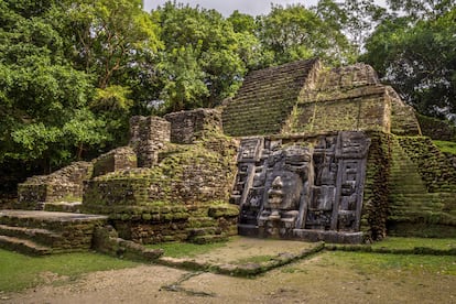 Pero el rincón imprescindible, el más conocido (dentro de lo que cabe, porque nada en Belice es demasiado conocido) es Lamanai (en maya significa “cocodrilo sumergido”), célebre por su impresionante arquitectura y su entorno selvático con vistas a la laguna de New River. Es uno de los yacimientos mayas más grandes, viejos y extensamente excavados en el norte de Belice, situado a unos 40 kilómetros al sur de Orange Walk. Reúne un conjunto de varios templos interesantes, como el de la Máscara, el más famoso, con dos estilizadas máscaras de cuatro metros de un hombre con tocado de cocodrilo, una a cada lado de las escaleras principales. Pero también descubrimos una cancha de juego de pelota, una de las más pequeñas del mundo maya, pero con el marcador de juego más grande descubierto hasta la fecha.