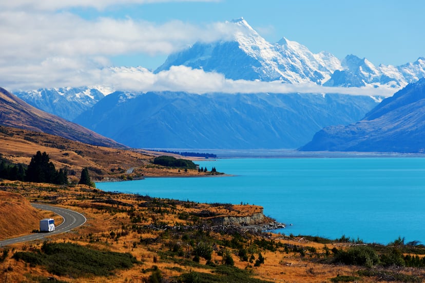 3. Lago Pukaki. Uno de los lagos más grandes de la Isla Sur. Su increíble color turquesa es debido a las partículas en suspensión que tiene procedentes de los glaciares cercanos. Es la antesala del monte Cook, con preciosas vistas de los Alpes del Sur (que se reflejan en sus aguas) y senderos para circunvalarlos.