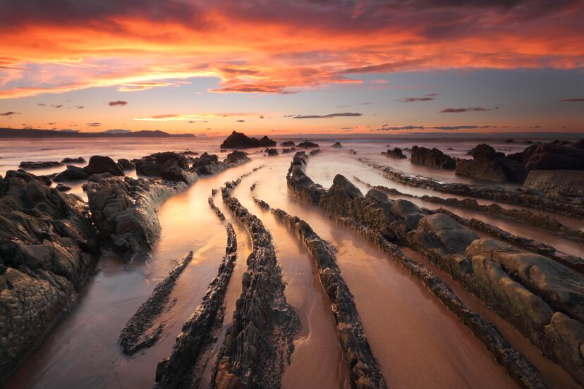 2. Geoparque de la Costa Vasca (País Vasco). Trece kilómetros de acantilados entre Deia y Zumaia donde aflora una espectacular formación rocosa conocida como flysch. Una auténtica enciclopedia sobre 60 millones de años de historia geológica del planeta Tierra. En Zumaia podremos observar la fina capa negra dejada por el impacto de un asteroide hace 66 millones de años, que supuso la extinción del 60% de las especies, dinosaurios incluidos.