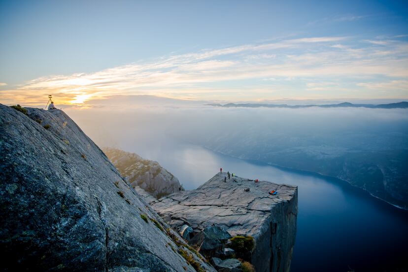 - Preikestolen (Noruega). La impresionante verticalidad del acantilado más famoso de Noruega solo es apreciable a vista de dron. Un balcón de piedra que cae por un acantilado de 600 metros cortado a pico sobre el Lysefjord, a una hora de distancia de la localidad de Stavanger. Es tan famoso que en verano pueden llegar a subir hasta aquí unas 5.000 personas al día.