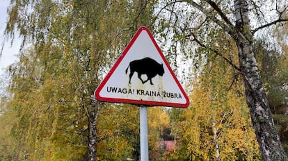 Las señales de tráfico que advierten de la presencia de ganado o animales en libertad sueltos son muy variopintas. En España la más habitual es la de la silueta de una vaca. En Asturias las hay con la de un oso. Y en el norte de Europa, dentro del triángulo rojo aparecen un reno o un alce. Pero cuando lo que ves es una silueta de bisonte, te quedas perplejo. Y más perplejidad aún experimentas cuando es un bisonte europeo de verdad, un bicho enorme y poderoso de casi mil kilos de peso, el que te hace pegar un frenazo porque está cruzando parsimonioso la carretera delante de tus narices.