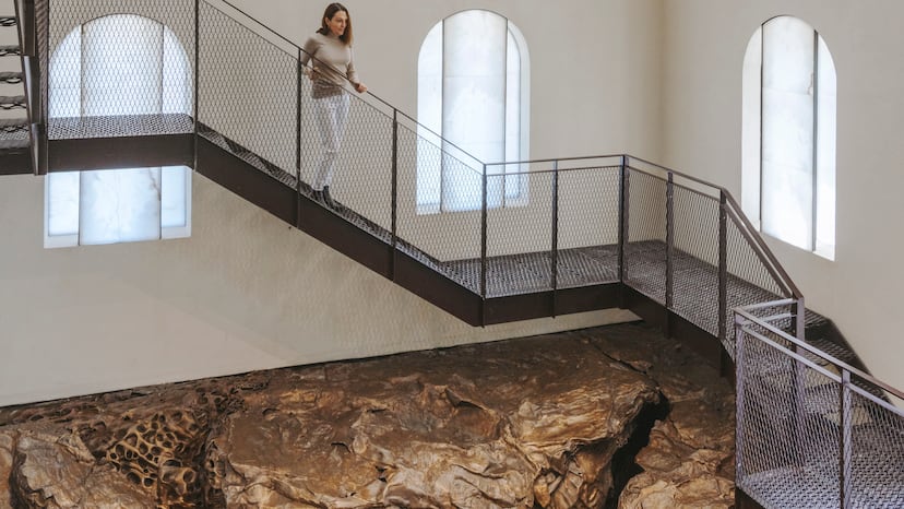 Subíamos al faro como quien sube a un cuento. Una procesión de almas en vilo, el runrún de la galerna y la cándida ilusión de que aquello, por un día, sería La isla misteriosa o La isla del tesoro o el escenario de una de terror, de esas en las que desaparece el último de la fila entre arbustos amenazantes y el graznido de las gaviotas. Solo faltaba Hitchcock. La casa del faro, del faro de la isla de Santa Clara, y el camino que lleva allí, primero por mar, luego por tierra, dan para mucho. Historias inquietantes, sueños de balleneros y ballenas y esa contemplación de la ciudad, tan distinta cuando se mira desde la isla. A Cristina Iglesias (San Sebastián, 1956) también le ha dado para mucho. Exactamente para volver al lugar del crimen; dicho de otro modo un poco menos noir, para regresar a su ciudad y plantar en las entrañas de la tierra, pero en medio de la bahía de la Concha, su obra más importante en lo personal y sin duda una de las más ambiciosas en lo artístico y en lo técnico. Hondalea significa en euskera —aunque es un término en desuso cuyo origen se remonta a escritos del siglo XVII— “abismo en el mar” o “fondo del mar”. Es el título elegido por la escultora donostiarra para bautizar a su nueva criatura, un colosal vaso de bronce de 15 toneladas que, incrustado en las tripas de Santa Clara y en lo que fue la casa del faro, deshabitada desde 1968, recrea la estratificación de los fondos marinos y el estallido de las olas contra las rocas. Es una expresión poética pero a la vez furiosamente realista del constante interés de Iglesias por todo aquello que tiene que ver con la geología.