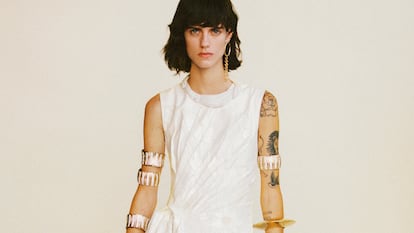 El fotógrafo Gorka Postigo la descubrió a través de sus redes sociales cuando tenía 22 años. Unos meses después, Louis Vuitton la contrató en exclusiva y hoy, a los 25, esta madrileña es uno de los rostros del momento. Esta temporada ha participado en 18 desfiles entre Milán y París. Desafía las reglas de la misma forma que cada vez más diseñadores agitan los pilares de la alta costura —que ella luce aquí— para hacerla avanzar. Siempre sin traicionar su esencia artesanal, sustentada en oficios centenarios que aúnan tradición e innovación.