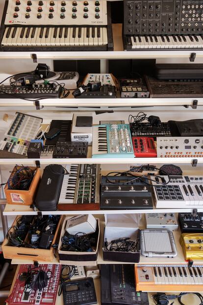 Como es menester, está lleno de instrumentos y cacharros varios, pero entre todo destaca un espacio compuesto de teclados sintetizadores, secuenciadores y demás aparatos electrónicos que el artista ha ido armando en los últimos tiempos y que es el responsable no solo de cómo es este disco, sino de que exista este disco. “A mí siempre me han gustado las máquinas, aunque a veces no se note en mis álbumes. He pasado por todo el software musical, he tocado el ratón, he hecho mil loops. Pero me apetecía hacer todo eso con la mano”, informa mientras trastea con esta especie de puente de mando del Enterprise que ha construido. “Quería un instrumento que fuera mío. No soy un pianista, no es mi refugio ni nada parecido. Me apetecía componer desde las máquinas y el reciclaje. Tras ver lo que hizo Max Richter con el reciclaje y Las Cuatro Estaciones de Vivaldi, queríamos reciclarlo a él. Y en aquel primer estadio del disco también monté temas con samplers de Alaska, Sade o Aretha Franklin. Mientras, Amaro empezó a currar con la sintonía de El hombre y la tierra, que es la más compleja”.