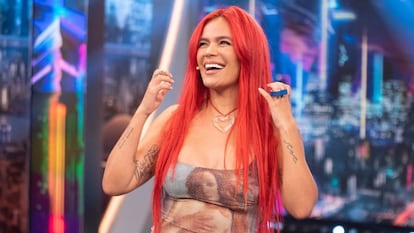 La estrella global del momento nos recibe a mediodía en la habitación de su hotel. “La tortilla estaba deliciosa”, dice Carolina Giraldo Navarro (Medellín, 32 años). Es martes 28 de febrero y acaba de sacar su cuarto álbum, Mañana será bonito (Universal Music). Una semana después, se convertiría en el primer LP femenino en español número uno en Billboard, la principal lista de Estados Unidos. La conocerán por Karol G. También como La Bichota —título de un hit suyo de 2020—. Con su intuitivo productor Ovy On The Drums ha logrado un disco que refrenda que el suculento ajiaco de la música urbana latina, o reguetón, manda hoy en el pop. Son 17 temas en los que brilla en solitario y con feats (features, colaboraciones) como el de su idolatrada Shakira, con quien funde desamores —Shakira pospiqué; ella tras el rapero puertorriqueño Anuel AA— para verterlos como oro líquido en la canción TQG (te quedó grande), otra más para la trituradora de récords. Mañana será bonito se llama así porque, como nos cuenta con franqueza la artista colombiana, el ayer fue realmente feo, más de lo que imaginamos frente a esta triunfadora jovial e inteligente, con botas de Dolce & Gabbana, conjunto denim y melena flamígera de tinte rojo resurrección.