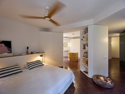 La reforma que ha hecho Inés Esnal ha mantenido, pero mejorado, la distribución un poco tradicional que tenía la vivienda. “Dejando todas las estancias donde estaban, simplemente con eliminar los tabiques del recibidor y del pasillo, así como los falsos techos, conseguimos que ganara mucho en luminosidad, al conectar la luz que entra por ambas terrazas”, explica. Fue, sobre todo, una renovación en la que aprovechó para hacer que los pasos fueran generosos, por si venían sillas de ruedas. Su baño, asimismo, también se planteó con una ducha a ras de suelo que facilitara su acceso. La mayor excentricidad ha sido la inclusión de unas anillas en las que el padre se cuelga para hacer sus ejercicios y estiramientos.