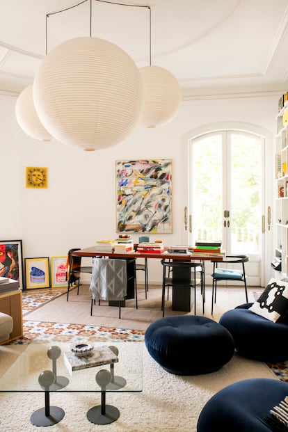 En el salón hay unos sofás Pacha de la firma danesa Gubi con sus otomanas a juego, una mesa de cristal diseñada por Philippe Starck para Disform, una mullida alfombra de Nordic Knots y lámparas colgantes de La Capell. En el comedor, una mesa de madera de Twoems, sillas de Takt Copenhagen y, en la pared blanca, un colorido cuadro de Ian Soler Bradley, un joven artista de Barcelona cuya obra está muy influenciada por la música de compositores como Karlheinz Stockhausen, Iannis Xenakis, György Ligeti o Pierre Boulez.