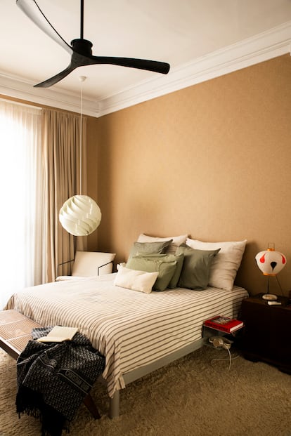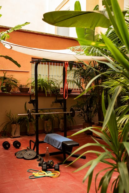 Por ahora, esas montañas de ropa no han llegado al patio. Cuando se mudó, lo visualizó como una terraza ajardinada para recibir a amigos y organizar cenas. Al final lo convirtió en un gimnasio. “Yo soy de un pueblo y siempre he vivido en una casita rodeado de naturaleza. Mi piso anterior en Barcelona, antes de mudarme a este, estaba en un pasaje. Las ventanas daban al edificio de enfrente. No tenía balcones ni terraza. Lo pasé tan mal que me prometí a mí mismo que mi siguiente casa tendría sí o sí un espacio exterior”, explica.