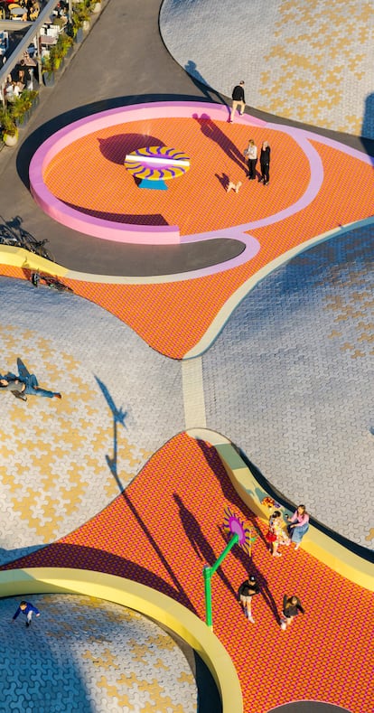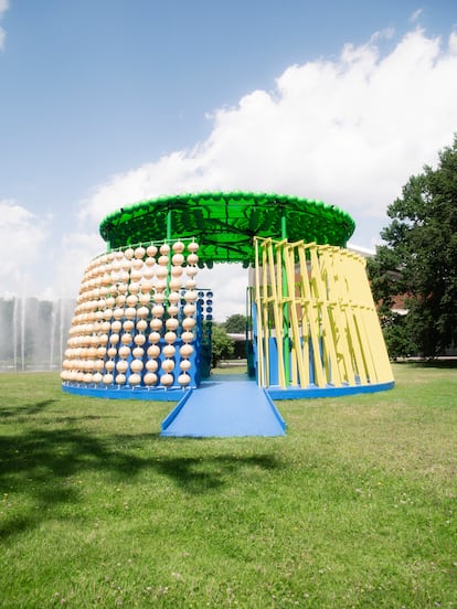 En el parque Parsloes, en el condado de Barking & Dagenham, al este de Londres, resalta como un lugar mágico e hipnótico para los niños la instalación llamada The Flamboyance of Flamingos (la extravagancia de los flamencos). La forma de estas aves seductoras, con su tono rosa brillante, construye columpios, toboganes, norias y bancos irresistibles que invitan a jugar en ellos. Para Ilori, que culminó el proyecto en 2022, ese tipo de huella alegre es la que motiva su deseo de trabajar en espacios públicos.