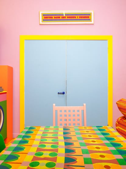 Al cruzar la puerta, la tristeza desaparece al instante. Los colores rosa, amarillo, naranja y azul, aquellos con los que la madre de Ilori inundó de elegancia y brillo una infancia en un barrio pobre de viviendas sociales, transforman en un remanso de optimismo el taller del artista.