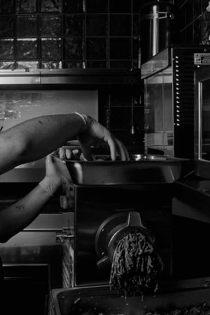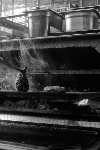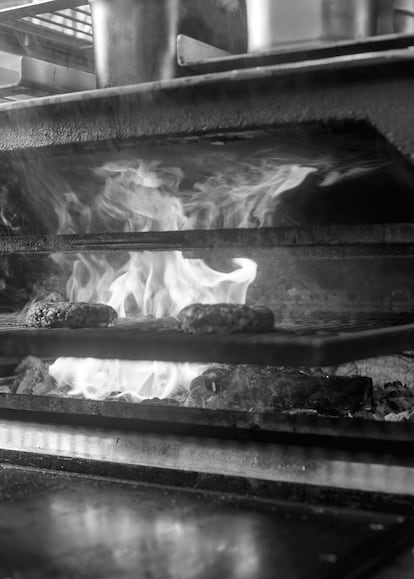 Unos años después se uniría al proyecto su hijo Pablo (Bogotá, 37 años), que, tras pasar por la escuela Le Cordon Bleu de Londres y DiverXo, se convirtió en el chef ejecutivo de una marca que ya cuenta con 10 establecimientos en Madrid y Barcelona. “Para mí, fue una evolución natural”, explica el cocinero. “Yo había empezado desde abajo del todo, y poco a poco fui creciendo dentro de DiverXo. Viví justo un momento de transición muy bonito, en el que pasamos de las dos estrellas Michelin que tenía en aquel momento a lograr la tercera, en 2013”. Su incorporación a New York Burger dio nuevos aires a una carta que sigue en constante renovación. La base, sin embargo, siempre es la misma. “Para la hamburguesa utilizamos varios cortes de carne. Tenemos tapa, tapilla y aguja, sobre todo. Y le ponemos algo de costilla, como tiene más grasa le da ese punto de untuosidad. Calculamos el porcentaje de grasa para hacerlo siempre lo más exacto posible. La grasa es vital, si no hay grasa no hay diversión”, asegura el chef, que añade que todo el proceso es cien por cien artesanal. Y esa carne, madurada entre 20 y 25 días a lo sumo, se cocina en un horno parrilla con carbón de nogal americano, para darle un toque ahumado que marca la diferencia.