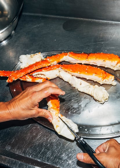 Mientras, en la mesa de al lado, otra cuadrilla de socios compartía como si nada, como si comieran aceitunas, unas patas de cangrejo real ruso (el que se utiliza para la elaboración del chatka) que se salían literalmente del plato. Las había traído Félix Espinosa, director gerente del negocio de importación de pescado Congelados Jaizkibel, que al final de la cena, cuando ya se iba, dio una noticia que dejó preocupado al personal: “Hay escasez de bacalao, y los precios han subido pero es que van a seguir subiendo, hemos tenido que ir otra vez a Terranova a buscarlo porque en Noruega, en Islandia y en las Islas Feroe hay cada vez menos”.