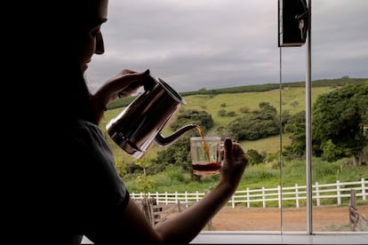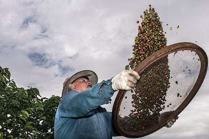 La larga cadena que lleva el café hasta usted —cultivo, selección de granos, exportación/importación, transporte, tueste, comercialización— empieza en una finca como la de los Oliveira, en el corazón cafetalero de Brasil. Las manos fuertes y rugosas de Mauri Oliveira, de 72 años, y el rostro marcado por el sol reflejan toda una vida volcada en cultivar el grano en la hacienda Campestre, que heredó de su madre y gestiona con sus hijas. Aunque la cotización del grano en la Bolsa de Nueva York está en niveles inéditos (la saca de 60 kilos llegó en mayo a 445 dólares, el doble que un año antes, para moderarse luego a 390 dólares), el ambiente aquí no es de euforia, ni mucho menos. Los actuales precios les preocupan. “Preferiríamos no haber perdido el 40% de la cosecha [por la sequía] y que los precios no estuvieran tan altos. Mejor tener un mercado estable con la saca a 2.000 reales [340 dólares], que ya es un buen beneficio, que tenerla a 3.000 y no tener café para cosechar”, apunta la hija mayor, Noemia Oliveira, de 36 años. Enamorada de los cafetales desde que de muy niña acompañaba a su abuelo, es agrónoma. Amplió en la universidad lo aprendido en la finca.
