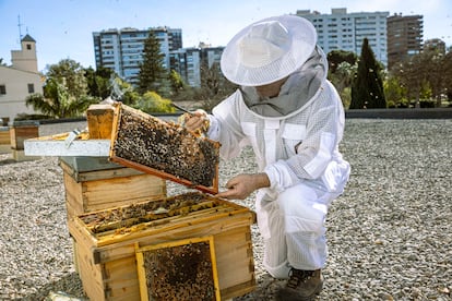 El apicultor Toni Fernández, en uno de los panales urbanos de la ciudad de Valencia.Mònica Torres