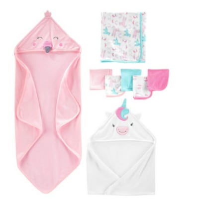 Este juego se compone de ocho toallas de baño para bebés con diferentes estampados y toques distintivos, ya que dos de ellas llevan una capucha para poder utilizarlas como capa envolvente de una manera práctica. Cada pieza tiene unas dimensiones de 23 x 23 centímetros y son aptas para la lavadora, garantizando una mayor higiene.