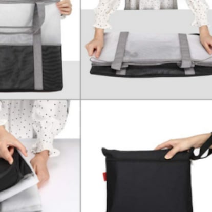 Se trata de una bolsa de playa extragrande, fabricada con un material de malla de nailon resistente, que además actúa como tejido transpirable y evita que se acumule la humedad o el moho. Asimismo, tiene un diseño plegable para almacenarla de manera compacta cuando no se utilice.