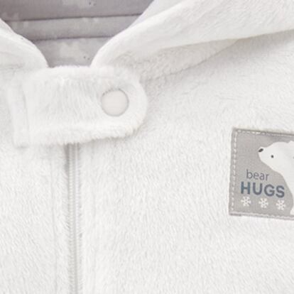 Tiene un cierre de cremallera frontal, que llega hasta la parte posterior para facilitar el cambio de pañales, y un diseño de capucha en 3D, con orejas de animal.