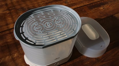 Otro detalle positivo es que, una vez terminado el ciclo, los artículos pueden mantenerse esterilizados hasta por 24 horas mientras no se abra la tapa. Gracias a este hermetismo, es posible poner a funcionar el esterilizador durante la noche para amanecer con los biberones listos para usar. Todo el montaje es sencillo, pero hay que procurar darle una limpieza regular. De lo contrario, la cal del agua se puede acumular en el interior, lo que provocaría fallos con el paso del tiempo.