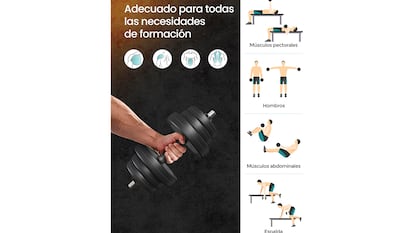 Este juego de dos mancuernas incluye una barra adicional, está fabricado con materiales antideslizantes y ocupa muy poco espacio de almacenamiento