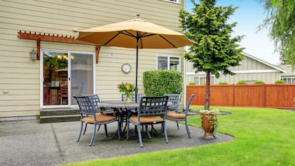 Patio con sombrilla y juego de muebles. irina88w (© Getty Images)