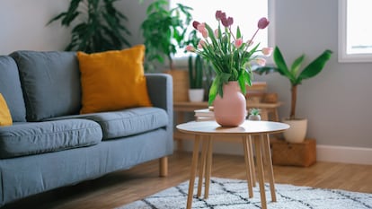 Las plantas son la decoración primaveral por excelencia. No hace falta llenar el salón de macetas, solo es necesario elegir dos o tres para darle vida. Puedes colocarlas en un estante para plantas o en otra superficie del salón.