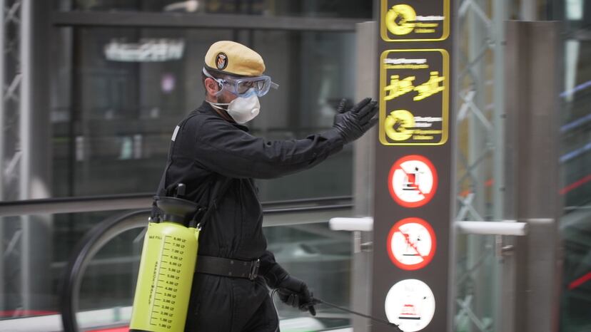 Apenas llegan viajeros a la estación de metro de la terminal 4 del aeropuerto Adolfo Suárez-Madrid Barajas y algunos directamente se ven obligados a darse la vuelta. Justo en el torno, un control policial se asegura de que nadie acceda sin motivo justificado. Cerca, un grupo con varios miembros de la Unidad Militar de Emergencias (UME) lleva desplegado desde las ocho de la mañana para hacer frente al coronavirus. Suman alrededor de cien efectivos en todas las terminales y su misión es desinfectar los lugares más transitados del aeródromo. “Vamos limpiando todas las zonas susceptibles donde hay contaminación o posible contaminación, donde hay más suciedad, por si hay una posible acumulación del virus”, explica Ismael Herrero Guerra, brigada del Primer Batallón de la UME, en este vídeo. “Hay que pasar por todas las zonas del aeropuerto. No hay tiempo establecido, nos dan una misión, iniciamos misión y hasta que la cumplamos”.