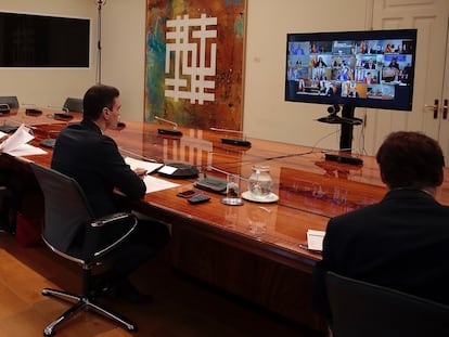 Mientras, el líder del PP ha manifestado este lunes su apoyo a medidas más restrictivas contra el coronavirus, como las que pretendía imponer, sin tener las competencias necesarias, el presidente popular de Murcia, Fernando López Miras, ordenando el cierre total de todas las actividades económicas no esenciales en la región. El Gobierno ya le ha advertido que no puede hacerlo. “Cualquier propuesta que hagan las comunidades autónomas y los Ayuntamientos que redunde positivamente en la protección de sus vecinos, creo que es positiva. Y el mando único está para armonizar esas medidas. Prefiero que pequemos en exceso y que al Gobierno no le tiemble el pulso. Lo que ha dicho el presidente de Murcia creo que es sensato", ha manifestado Pablo Casado durante una rueda de prensa telemática desde la sede de Génova tras hablar con el presidente, Pedro Sánchez, y con alcaldes de su partido, entre ellos el de la capital, José Luis Martínez-Almeida, la ciudad española más afectada por la epidemia.