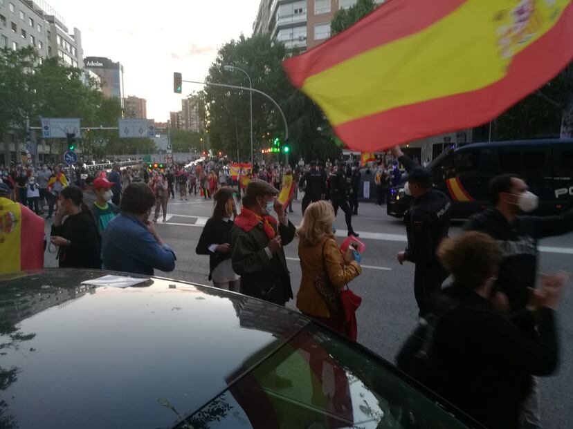 Enarbolando banderas de España y cacerolas han coreando gritos como “¡Gobierno dimisión!”, “¡Libertad!” o “Sánchez a prisión”, junto a otros aislados de “Somos españoles, no venezolanos”. Al lugar han acudido seis furgones del Cuerpo Nacional de Policiá que se han dedicado a dar vueltas por la calzada intentando sin éxito dispersar a los concentrados. Aunque varios agentes han bajado de los vehículos, en ningún momento han cargado contra los manifestantes ni han intentado disolverlos. “Da gusto ¿verdad? Ojalá todas las manifestaciones fueran como esta”, le decía un vecino a un policía.