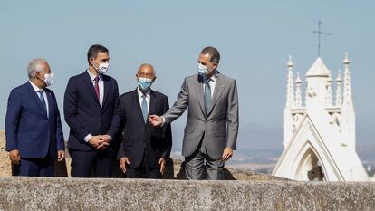 En los momentos previos al acto se ha podido ver la cercanía en especial de los primeros ministros, Pedro Sánchez y António Costa, ambos socialdemócratas. “Perdona, António, pero no te puedo dar un abrazo”, le ha dicho Sánchez a Costa. El Rey también se ha disculpado con De Sousa por no poder estrecharle la mano. A su llegada a la alcazaba de Badajoz, donde se producía el primer acto simbólico, que se ha rematado con otro en el castillo de Elvas, en Portugal, el Rey ha lanzado la mano a Sánchez, que le esperaba, pero inmediatamente ha rectificado y ambos se han saludado con un gesto, sin tocarse. Los dos jefes de Estado y los dos primeros ministros llevaban en todo momento puesta la mascarilla, que solo se han quitado en el momento solemne de los himnos y la foto de familia. En Badajoz, durante la visita, se han escuchado gritos de apoyo a la monarquía pero también protestas y gritos de “gastos reales para escuelas y hospitales”.